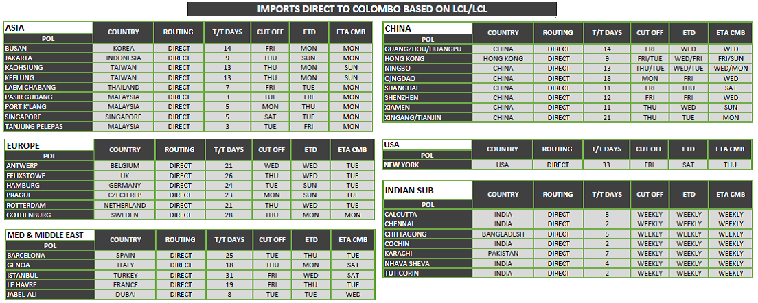 Apart from LCL loads we could offer that extra service to your supplier together with our counterparts in each destination / port and could keep you informed of your FCL & Air shipments to Colombo saving you time and money and keep you updated of all developments, vessel availability, routings, transits and the arrival dates in Colombo.